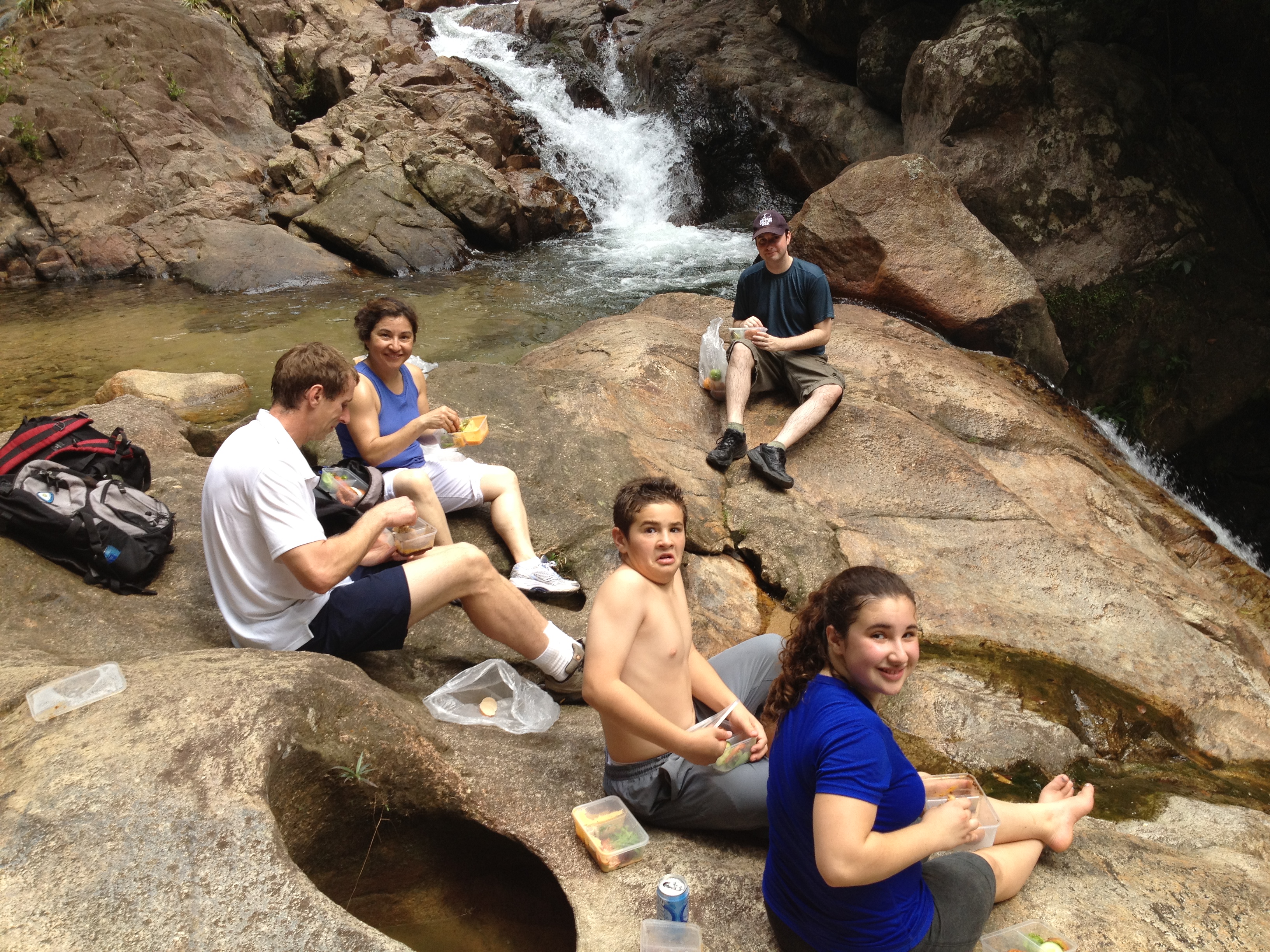 After providing lunch, our guide also escorted my friends’ kids, Sara and Jason, a bit upstream to try a soak in the natural Jacuzzi where the tumbling water hits a flat pan of rock. Both kids came back with big smiles. And leeches. These were tiny little crittters — and easily dealt with upon discovery. (We just had to track where the blood was coming from!)