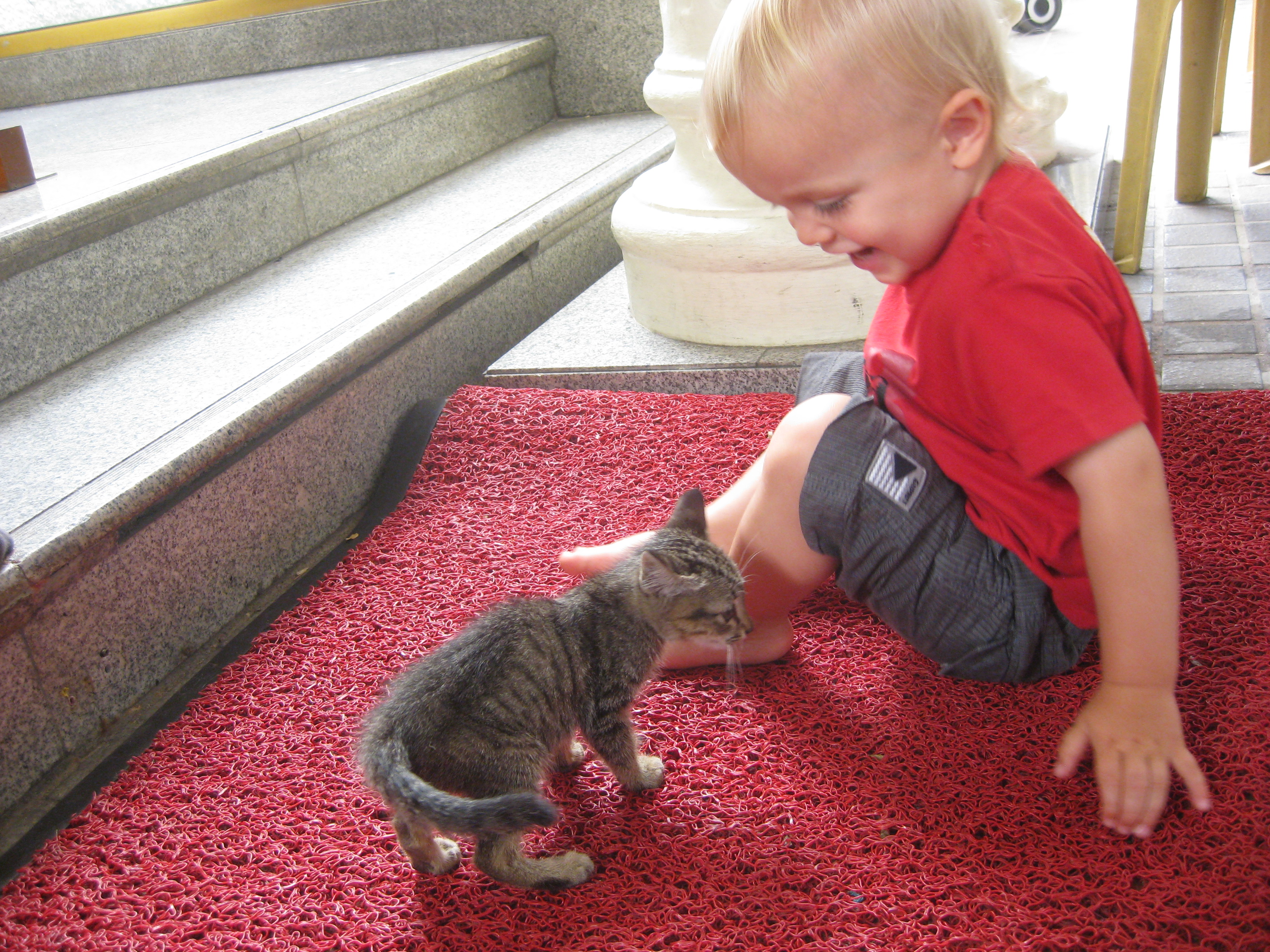 That might be one of the ugliest animals I’ve ever seen. I wasn’t sure why that one was chosen as it seemed like a rather odd and repulsive choice. It turns out that there’s actually a famous Malaysian folk tale about the Mouse Deer. I still would have chosen a different story and animal personally. On a lighter note, we were with my second uncle and his family. His youngest son found some kittens to play with so here’s a picture of him playing with the kittens to make up for that picture of the Mouse Deer.