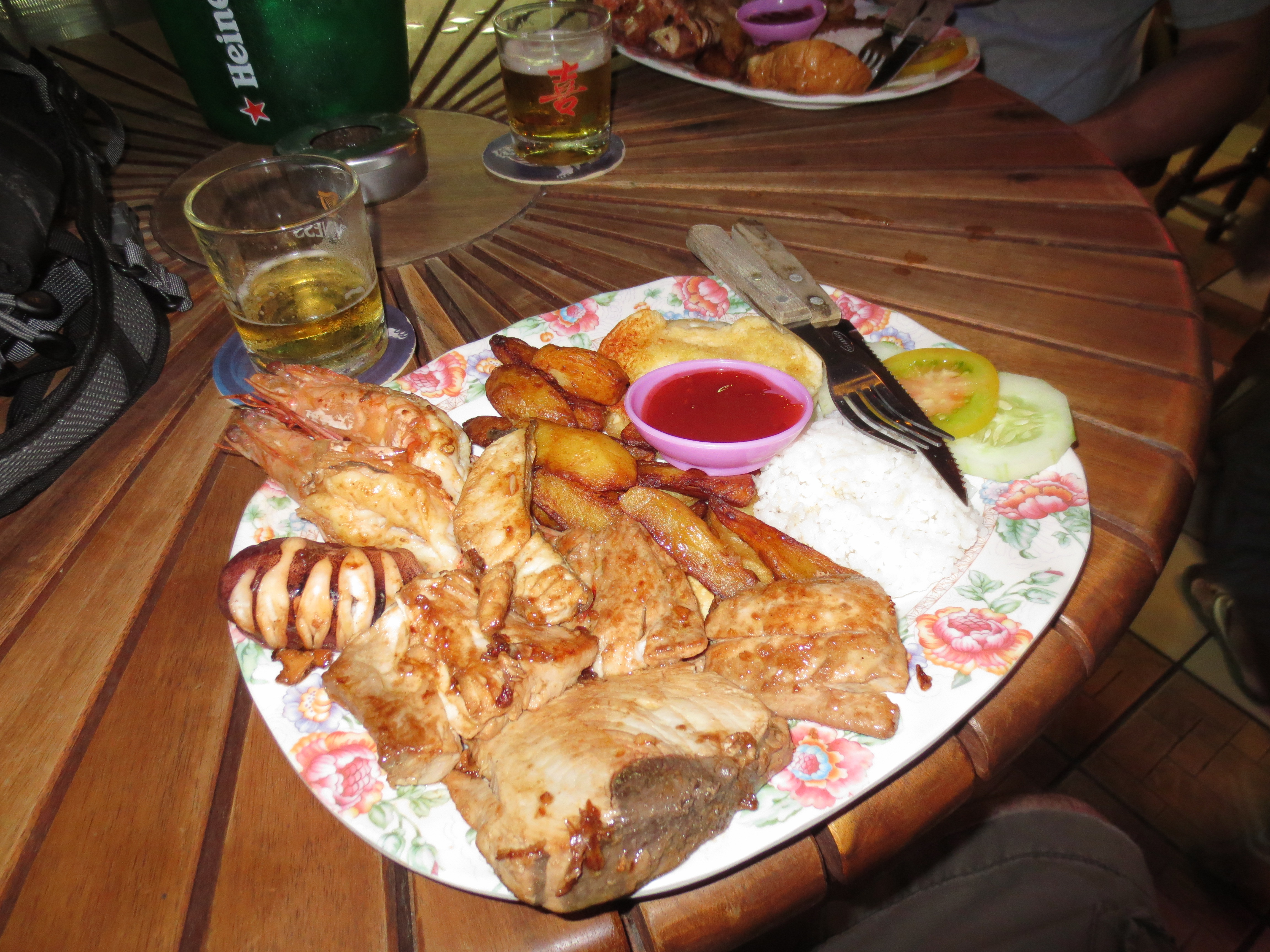 That night we decided to try out the seafood combo plate for dinner. It was made by this very nice old Malaysian guy and was right in front of a bar so naturally we went to get beverages in the bar as well. After a few beverages, the guy came in with our dinners. It was a smorgasbord of different seafood. I’m normally not much of a seafood person but after a day of diving and several waters with hops in them the whole dish looked delicious.