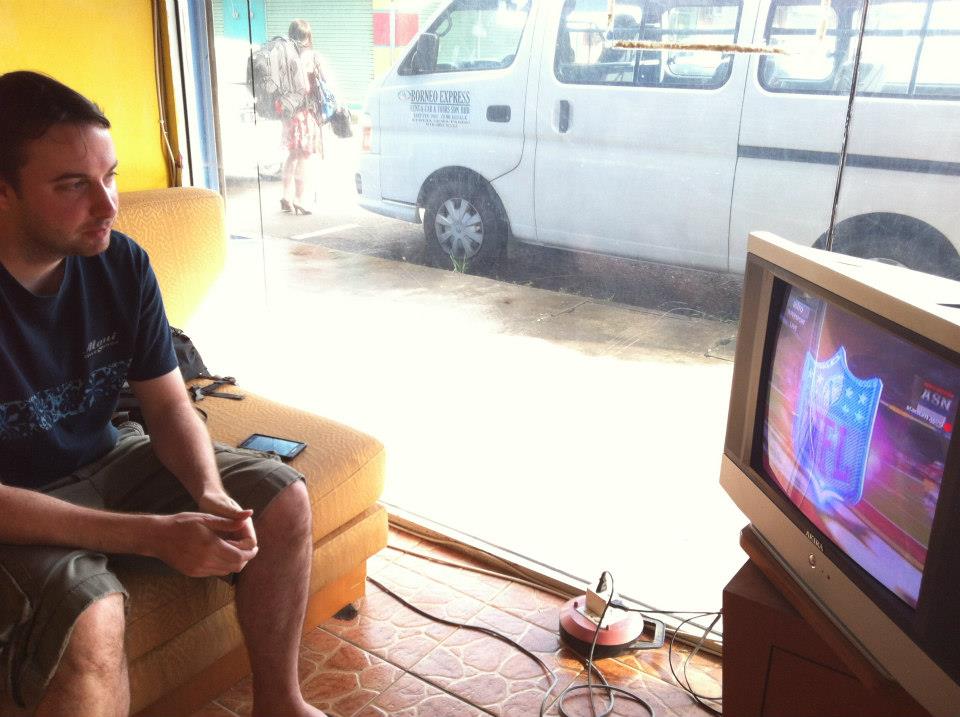 Wait, Monday? Well in Malaysia the Super Bowl kicked off Monday morning. Fortunately we were able to find a travel hostel with a TV and Astro Sports (Astro is a cable provider in Asia) that was airing the Super Bowl.